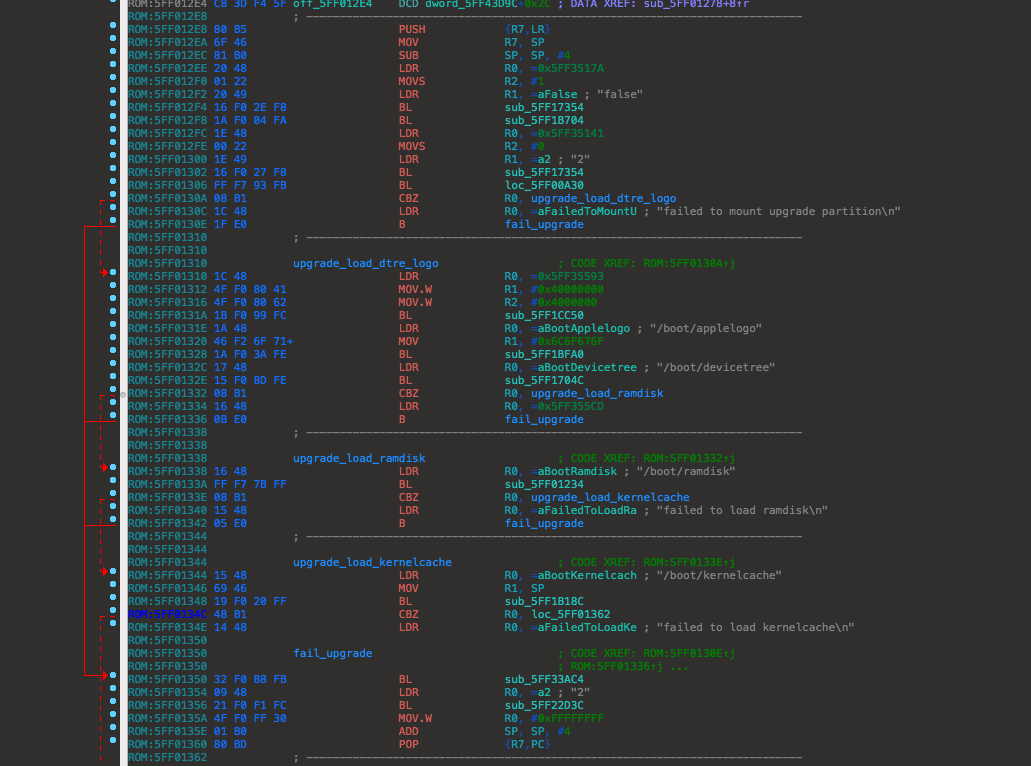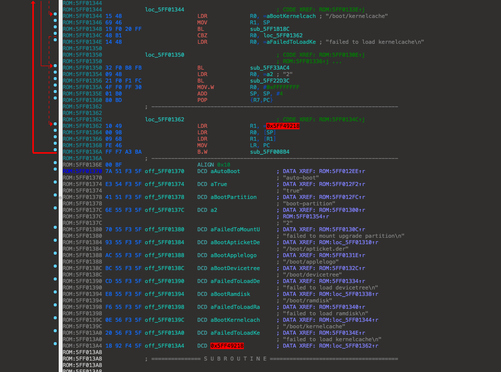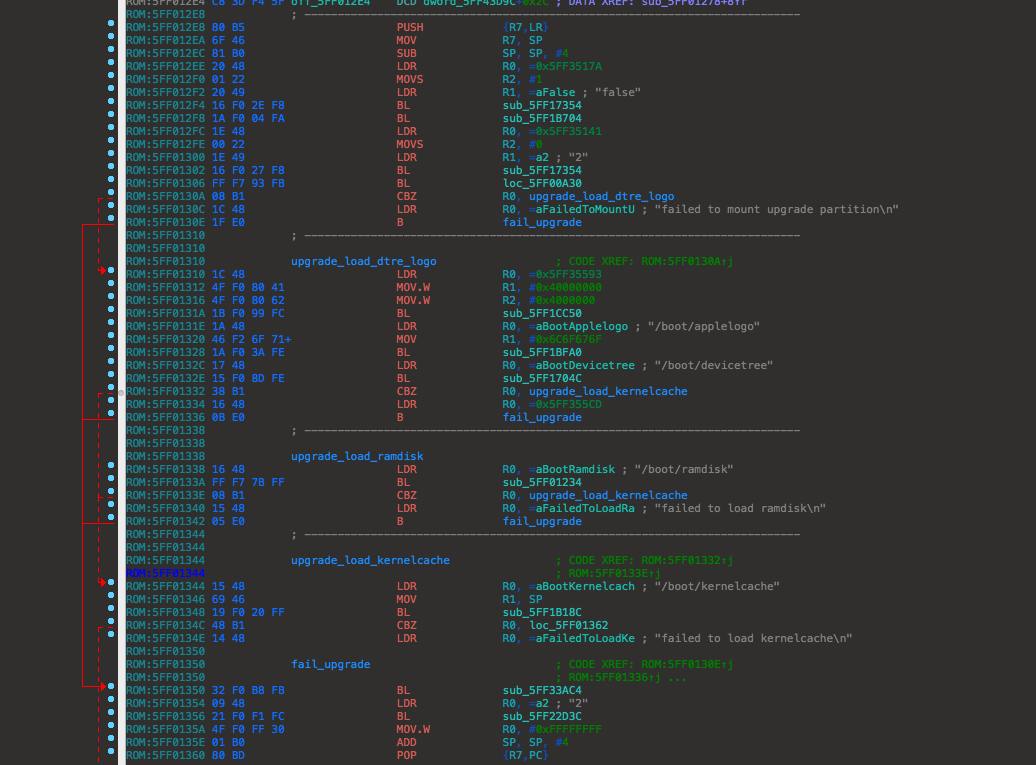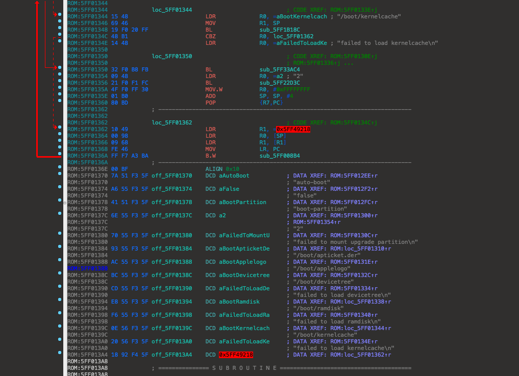 We need to calculate values in order to complete in skipping ramdisk loading. We do this by grabbing the offset of "upgrade_load_kernelcache" (0x1344)
